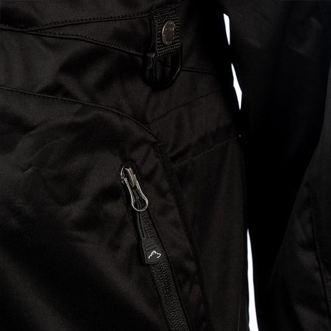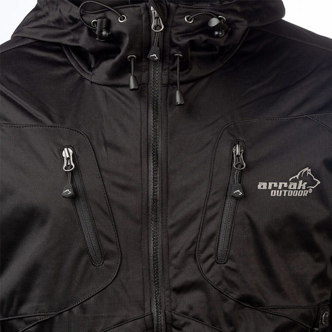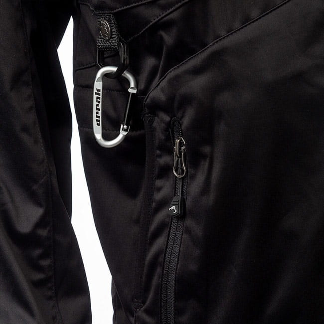 Akka Jacke in Schwarz von Arrak bestehend aus Polyester hat eine Wassersäule von 3.000 mm, mit verstellbaren Bündchen an den Handgelenken und Daumenlöchern. Insgesamt hat die Jacke sieben Taschen, davon eine große Rückentasche.