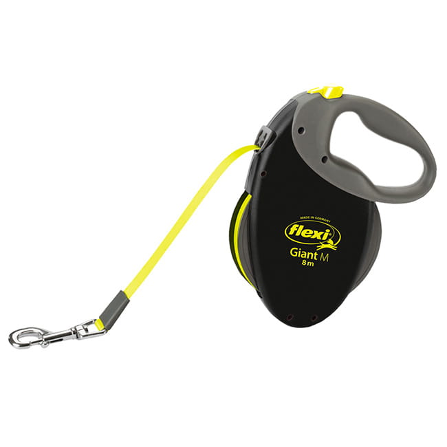 Die flexi Giant Rollleine bietet Hunden bis 50?kg bis zu 8?m Bewegungsfreiheit bei voller Kontrolle. Das neonfarbene Gurtband mit reflektierendem Aufdruck sorgt für hohe Sichtbarkeit, der Softgriff liegt angenehm in der Hand. Durch die Aufrollautomatik bleibt die Leine stets straff und einsatzbereit – ideal für aktive Spaziergänge bei Tag und Nacht. Erhältlich in Größe?M und Größe?L.